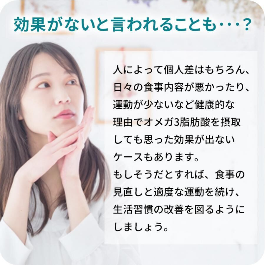 人によって個人差はもちろん、日々の食事内容が悪かったり、運動が少ないなど健康的な理由で、オメガ3脂肪酸を摂取しても思った効果が出ないケースもあります。もしそうだとすれば、食事の見直しと適度な運動を続け、生活習慣の改善を図るようにしましょう。