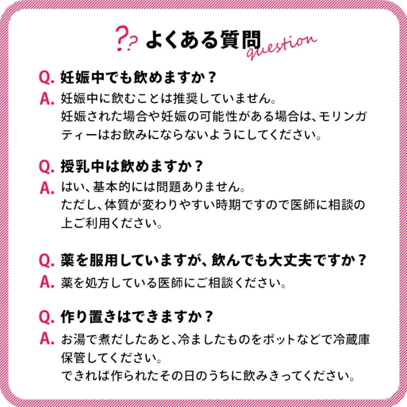 A.妊娠中に飲むことは推奨していません。妊娠された場合や妊娠の可能性がある場合は、モリンガティーはお飲みにならないようにしてください。