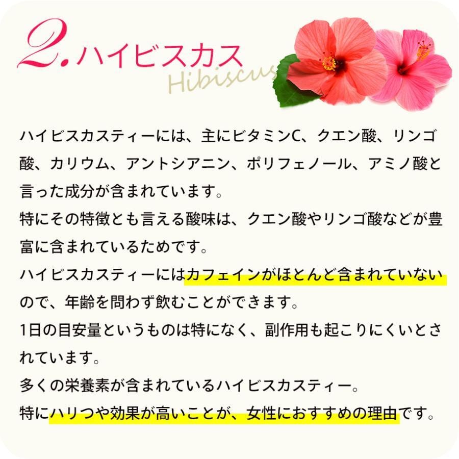 ハイビスカスティーには、主にビタミンC、クエン酸、リンゴ酸、カリウム、アントシアニン、ポリフェノール、アミノ酸と言った成分が含まれています。